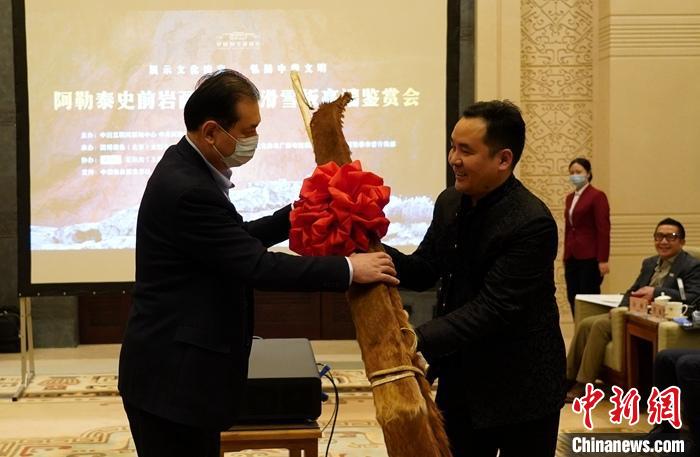 座談會上,阿勒泰地區(qū)行政公署副專員賽力克·馬哈提代表阿勒泰地區(qū)行署向國博雅集(北京)文物有限公司贈送了阿勒泰古老毛皮雪板。