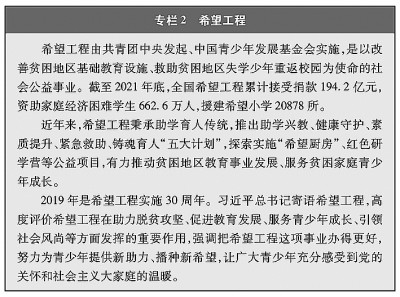 教育機會更加均等。中國教育事業(yè)優(yōu)先發(fā)展不斷深化,中國青年享有更加平等、更高質量的教育機會。2021年,中國義務教育鞏固率達95.4%;高中階段毛入學率達91.4%;高等教育毛入學率達57.8%、在學總規(guī)模達4430萬人,居世界第一,越來越多的青年打開了通往成功成才大門的重要路徑。覆蓋學前教育至研究生教育的學生資助政策體系建成且日趨完善,2020年資助資金總額超過2400億元、資助學生近1.5億人次,實現(xiàn)“三個全覆蓋”②。義務教育階段進城務工人員隨遷子女、農(nóng)村和貧困地區(qū)學生等群體受教育權益得到充分保障。2020年,85.8%的進城務工人員隨遷子女在公辦學校就讀或享受政府購買學位服務;2012年至2021年,農(nóng)村和貧困地區(qū)重點高校專項招生計劃定向招生超過82萬人,讓更多的青年公平享有接受更好教育的機會,阻斷貧困的代際傳遞。