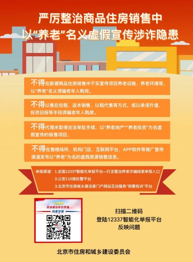 據(jù)“安居北京”公眾號(hào)消息,北京住建委發(fā)布提示,不得在新建商品住房銷售中不實(shí)宣傳項(xiàng)目養(yǎng)老設(shè)施、養(yǎng)老環(huán)境等,以“養(yǎng)老”名義誘騙老年人購(gòu)房。不得以售后包租、返本銷售、以租代售等方式,或以承諾升值、投資回報(bào)等手段誘騙老年人購(gòu)房。