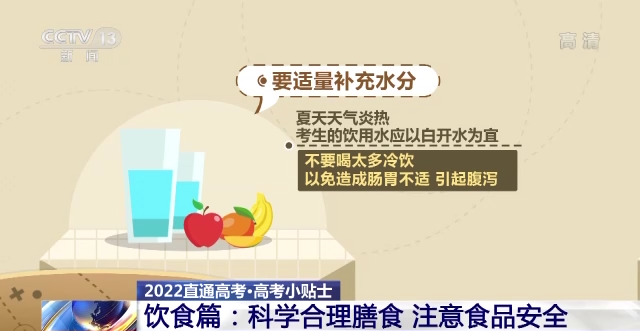 同時(shí),要適量補(bǔ)充水分。夏天天氣炎熱,考生的飲用水應(yīng)以白開水為宜,不要喝太多冷飲,以免造成腸胃不適,引起腹瀉。如遇高溫天氣,建議考生適當(dāng)補(bǔ)充淡鹽水,多吃新鮮蔬果,清淡飲食。