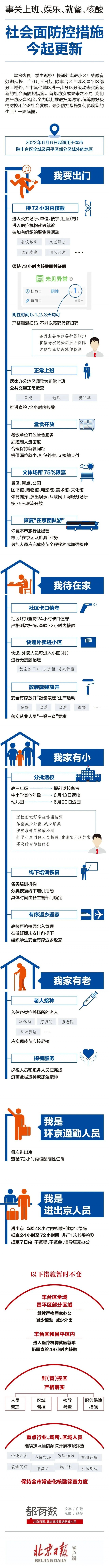 自6月6日起,除豐臺(tái)區(qū)全域及昌平區(qū)部分區(qū)域外,全市其他地區(qū)進(jìn)一步分區(qū)分級(jí)動(dòng)態(tài)實(shí)施最新的社會(huì)面防控措施。