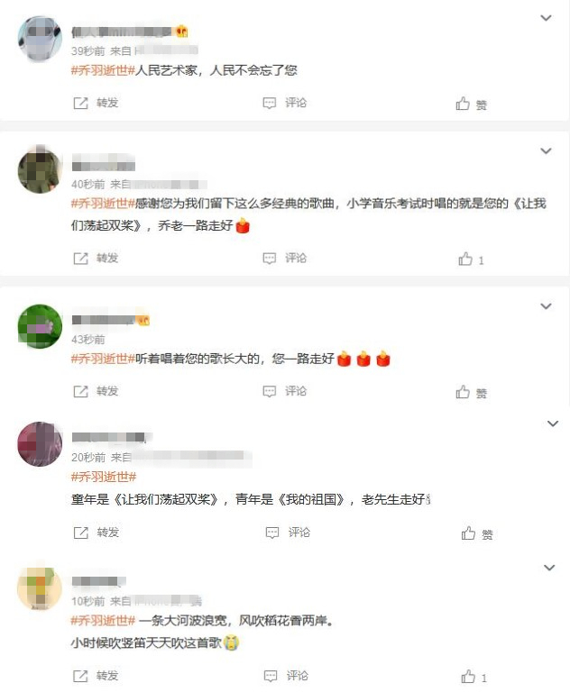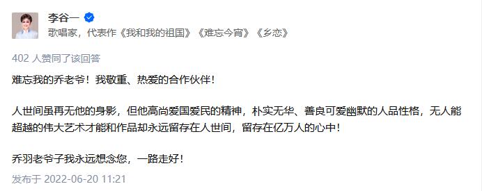 李谷一在聽聞喬羽逝世的消息后,第一時(shí)間發(fā)文悼念:“難忘我的喬老爺!我敬重、熱愛的合作伙伴!人世間雖再無他的身影,但他高尚愛國(guó)愛民的精神,樸實(shí)無華、善良可愛幽默的人品性格,無人能超越的偉大藝術(shù)才能和作品卻永遠(yuǎn)留存在人世間,留存在億萬人的心中!喬羽老爺子我永遠(yuǎn)想念您,一路走好!”