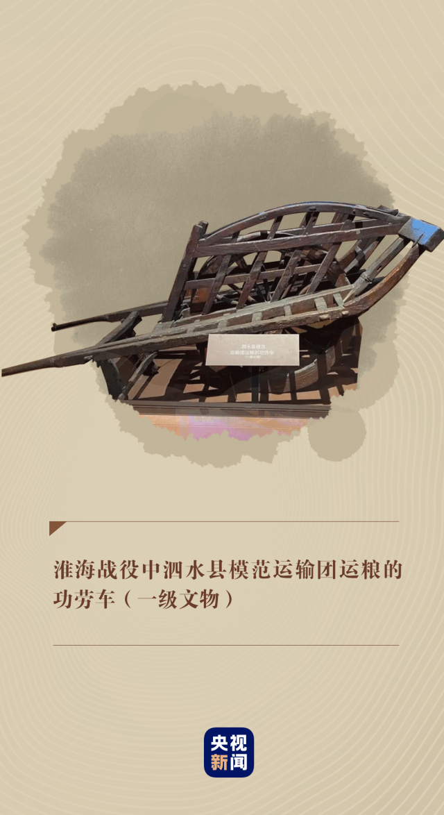 在中國(guó)共產(chǎn)黨歷史展覽館,靜臥著一輛淮海戰(zhàn)役中泗水縣模范運(yùn)輸團(tuán)運(yùn)糧的功勞車。它向人們講述著當(dāng)年硝煙彌漫的戰(zhàn)場(chǎng)上,人民群眾團(tuán)結(jié)一心,用一輛輛小車推出戰(zhàn)役勝利的感人故事。