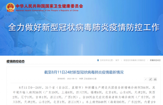 8月11日0—24時(shí),31個(gè)省(自治區(qū)、直轄市)和新疆生產(chǎn)建設(shè)兵團(tuán)報(bào)告新增確診病例704例。其中境外輸入病例56例(廣東19例,上海8例,四川7例,福建6例,北京4例,山東4例,天津2例,陜西2例,遼寧1例,吉林1例,浙江1例,廣西1例),含18例由無(wú)癥狀感染者轉(zhuǎn)為確診病例(廣東7例,四川5例,天津2例,山東2例,北京1例,浙江1例);本土病例648例(海南595例,廣東22例,內(nèi)蒙古9例,西藏7例,福建5例,上海2例,河南1例,重慶1例,四川1例,貴州1例,云南1例,陜西1例,甘肅1例,新疆1例),含11例由無(wú)癥狀感染者轉(zhuǎn)為確診病例(廣東7例,海南1例,四川1例,貴州1例,新疆1例)。無(wú)新增死亡病例。無(wú)新增疑似病例。