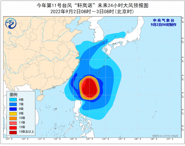 大風(fēng)預(yù)報(bào):9月2日08時(shí)至3日08時(shí),巴士海峽、臺(tái)灣海峽、臺(tái)灣以東洋面、東海大部及釣魚島附近海域、長(zhǎng)江口區(qū)、杭州灣,以及臺(tái)灣島北部和東部沿海、福建中北部沿海、浙江沿海、上海沿海、江蘇南部沿海將有6-8級(jí)大風(fēng),陣風(fēng)9-10級(jí),其中臺(tái)灣以東洋面的風(fēng)力有9-12級(jí),陣風(fēng)11-15級(jí),“軒嵐諾”中心經(jīng)過的附近海面的風(fēng)力有13-15級(jí),陣風(fēng)可達(dá)16-17級(jí)。