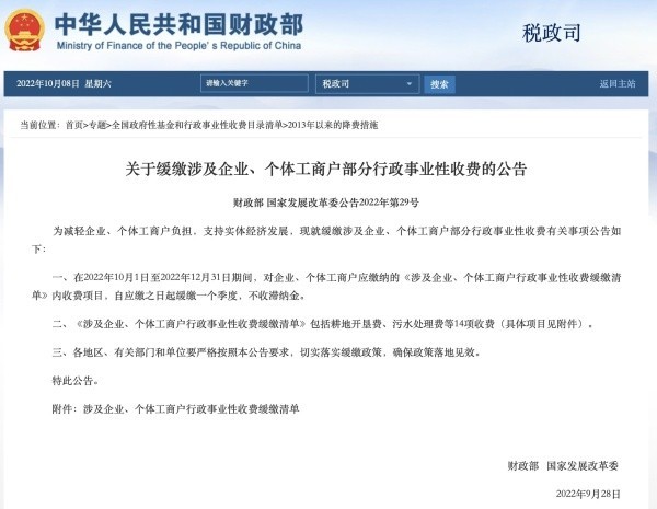 一、在2022年10月1日至2022年12月31日期間,對企業(yè)、個體工商戶應繳納的《涉及企業(yè)、個體工商戶行政事業(yè)性收費緩繳清單》內(nèi)收費項目,自應繳之日起緩繳一個季度,不收滯納金。