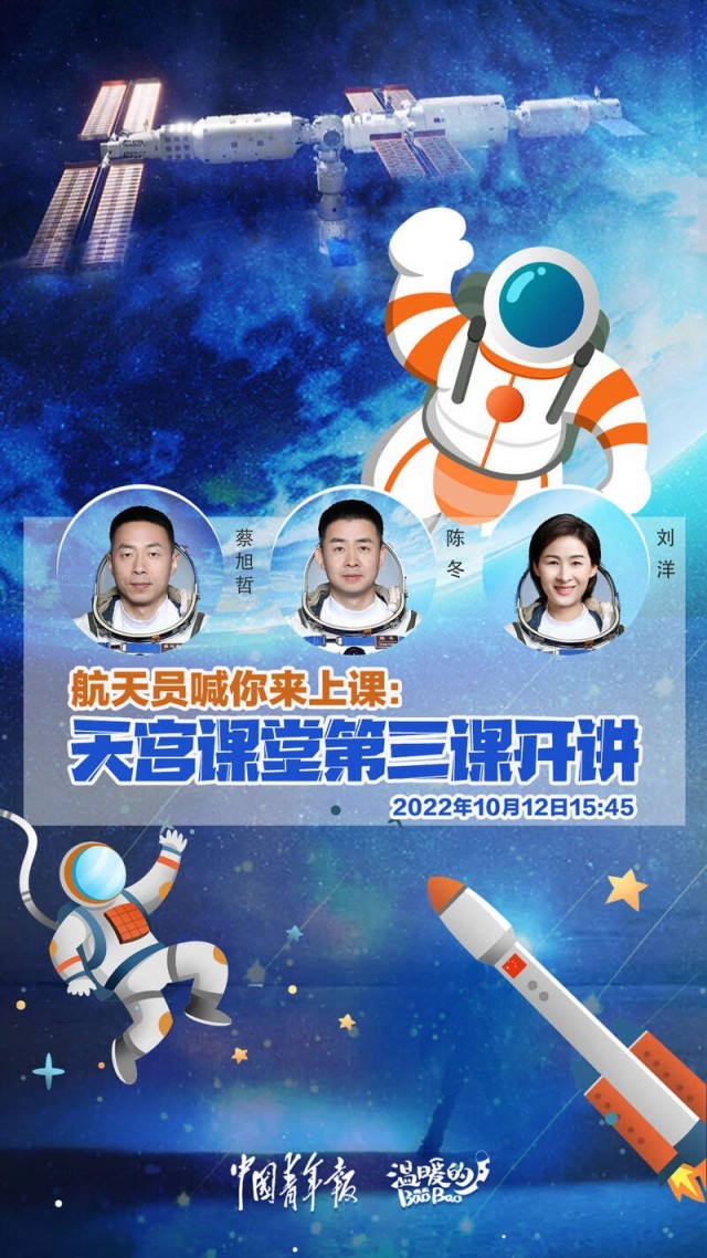 中國青年報客戶端北京10月12日電(中青報·中青網(wǎng)記者 邱晨輝)據(jù)中國載人航天工程辦公室消息,北京時間2022年10月12日16時01分,“天宮課堂”第三課在中國空間站開講,新晉“太空教師”陳冬、劉洋、蔡旭哲為廣大青少年帶來一場精彩的太空科普課,這是中國航天員首次在問天實驗艙內(nèi)進行授課。