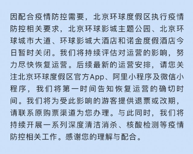 據(jù)@北京環(huán)球度假區(qū) 微博消息,因配合疫情防控需要,北京環(huán)球度假區(qū)執(zhí)行疫情防控相關(guān)要求,北京環(huán)球影城主題公園、北京環(huán)球城市大道、環(huán)球影城大酒店和諾金度假酒店今日暫時(shí)關(guān)閉。我們將持續(xù)評(píng)估對(duì)運(yùn)營的影響,努力盡快恢復(fù)運(yùn)營。后續(xù)最新的運(yùn)營安排,請(qǐng)您關(guān)注北京環(huán)球度假區(qū)官方App、阿里小程序及微信小程序,我們將第一時(shí)間告知恢復(fù)運(yùn)營的確切時(shí)間。我們將為受此影響的游客提供退票或改期,請(qǐng)聯(lián)系原購票渠道為您辦理。與此同時(shí),我們將持續(xù)開展一系列深度清潔消殺、核酸檢測(cè)等疫情防控相關(guān)工作。感謝您的理解與配合。