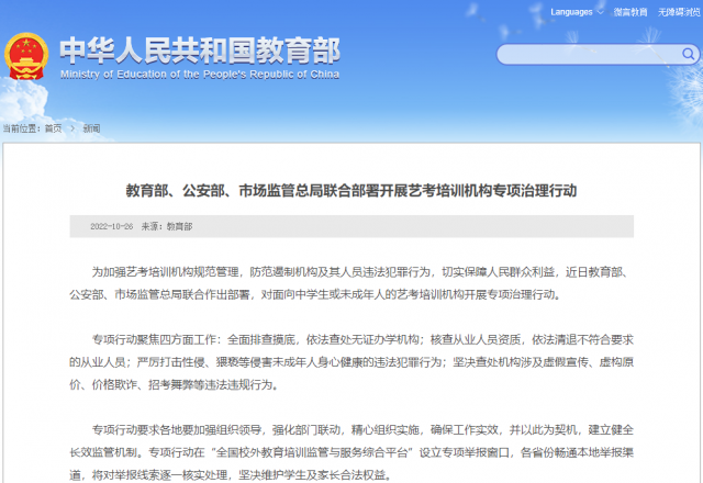 據教育部網站消息,為加強藝考培訓機構規(guī)范管理,防范遏制機構及其人員違法犯罪行為,切實保障人民群眾利益,近日教育部、公安部、市場監(jiān)管總局聯合作出部署,對面向中學生或未成年人的藝考培訓機構開展專項治理行動。