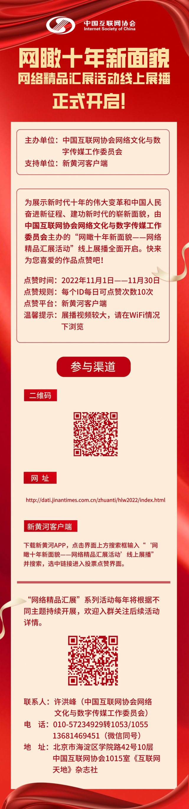 為展示新時(shí)代十年的偉大變革和中國(guó)人民奮進(jìn)新征程、建功新時(shí)代的嶄新面貌,11月1日,由中國(guó)互聯(lián)網(wǎng)協(xié)會(huì)網(wǎng)絡(luò)文化與數(shù)字傳媒工作委員會(huì)(以下簡(jiǎn)稱工作委員會(huì))主辦的“網(wǎng)絡(luò)精品匯展”第三季“網(wǎng)瞰十年新面貌”網(wǎng)絡(luò)精品匯展活動(dòng)線上展播啟動(dòng),在網(wǎng)絡(luò)空間唱響正能量。歡迎廣大網(wǎng)民點(diǎn)擊“閱讀原文”進(jìn)入活動(dòng)頁(yè)面為喜愛的作品點(diǎn)贊,展播時(shí)間截至11月30日。