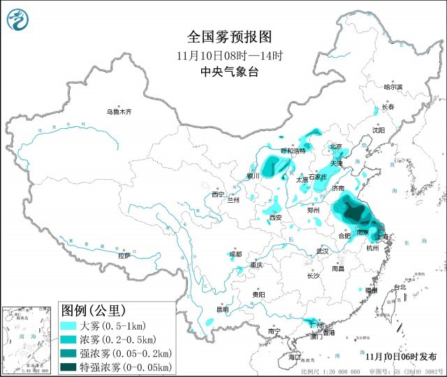 中央氣象臺(tái)今天早晨繼續(xù)發(fā)布大霧黃色預(yù)警:預(yù)計(jì),11月10日早晨至上午,北京東部、天津、河北東北部和南部、山西東南部、山東西北部和南部、江蘇、安徽東部、上海、浙江北部以及陜西中北部、內(nèi)蒙古河套地區(qū)等地的部分地區(qū)將有能見度不足1公里的大霧天氣,其中,天津南部、江蘇北部、安徽東北部、上海、浙江北部以及內(nèi)蒙古河套地區(qū)等地的部分地區(qū)有能見度不足500米的濃霧,局地能見度不足50米。