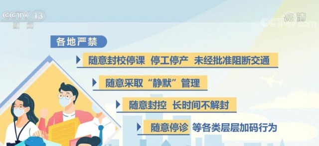 《通知》明確要求,各地嚴(yán)禁隨意封校停課、停工停產(chǎn)、未經(jīng)批準(zhǔn)阻斷交通,隨意采取“靜默”管理,隨意封控、長(zhǎng)時(shí)間不解封,隨意停診等各類層層加碼行為,加大通報(bào)、公開曝光力度,對(duì)造成嚴(yán)重后果的依法依規(guī)嚴(yán)肅追責(zé)。對(duì)于沒有發(fā)生疫情的地區(qū),要嚴(yán)格按照第九版防控方案確定的范圍對(duì)風(fēng)險(xiǎn)崗位、重點(diǎn)人員開展核酸檢測(cè),既不能隨意擴(kuò)大核酸檢測(cè)范圍,也不能隨意擴(kuò)大人員管控、社區(qū)封控、隔離轉(zhuǎn)運(yùn)范圍。糾正“一天兩檢”“一天三檢”等不科學(xué)做法。疫情發(fā)生地要分類有序做好外地滯留人員疏解,目的地不得拒絕接受滯留人員返回,既要避免疫情外溢,也不得加碼管控。