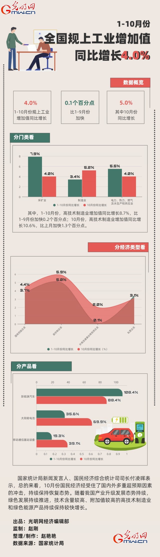 數(shù)據(jù)顯示,1-10月份,全國(guó)規(guī)模以上工業(yè)增加值同比增長(zhǎng)4.0%,比1-9月份加快0.1個(gè)百分點(diǎn)。分三大門(mén)類看,采礦業(yè)增加值同比增長(zhǎng)7.9%,制造業(yè)增長(zhǎng)3.4%,電力、熱力、燃?xì)饧八a(chǎn)和供應(yīng)業(yè)增長(zhǎng)5.5%。高技術(shù)制造業(yè)增加值同比增長(zhǎng)8.7%,比1-9月份加快0.2個(gè)百分點(diǎn)。分經(jīng)濟(jì)類型看,國(guó)有控股企業(yè)增加值同比增長(zhǎng)3.7%;股份制企業(yè)增長(zhǎng)5.0%,外商及港澳臺(tái)商投資企業(yè)增長(zhǎng)0.1%;私營(yíng)企業(yè)增長(zhǎng)3.4%。分產(chǎn)品看,新能源汽車、太陽(yáng)能電池、移動(dòng)通信基站設(shè)備等綠色智能產(chǎn)品產(chǎn)量同比分別增長(zhǎng)108.4%、35.6%、19.3%。