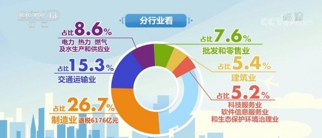 數(shù)據(jù)顯示,分行業(yè)看,制造業(yè)是受益最明顯的行業(yè),退稅6176億元,占比26.7%;交通運(yùn)輸業(yè)占15.3%;電力、熱力、燃?xì)饧八a(chǎn)和供應(yīng)業(yè)、批發(fā)和零售業(yè)、建筑業(yè)、科技服務(wù)業(yè)、軟件信息服務(wù)業(yè)和生態(tài)保護(hù)環(huán)境治理業(yè)占比從8.6%到5.2%不等。