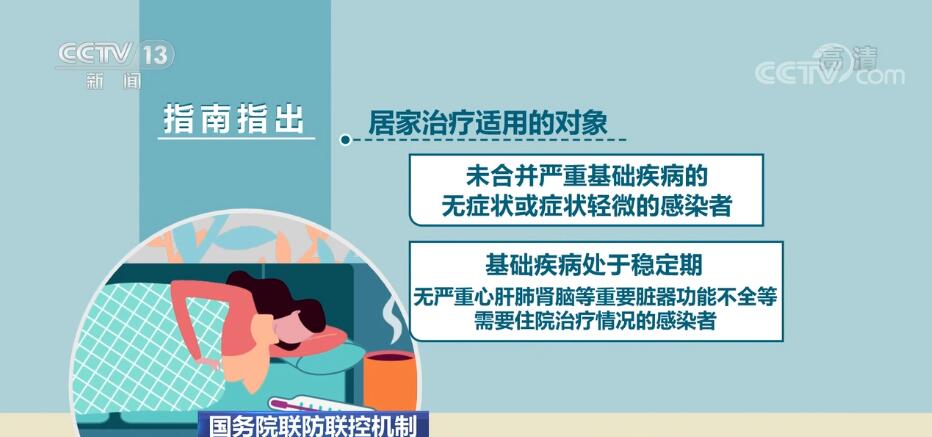 指南指出,居家治療適用的對象是:未合并嚴(yán)重基礎(chǔ)疾病的無癥狀或癥狀輕微的感染者;基礎(chǔ)疾病處于穩(wěn)定期,無嚴(yán)重心肝肺腎腦等重要臟器功能不全等需要住院治療情況的感染者。