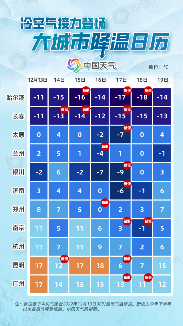 大城市中,廣州、南京、濟(jì)南、銀川、太原、哈爾濱等地都將在17日前后集中創(chuàng)下今年下半年來最高氣溫的最低值,冷空氣甚至能翻上高原影響昆明,17日昆明的最高氣溫會陡降至6℃,單日降幅12℃,如此低的氣溫在12月中旬也不多見。