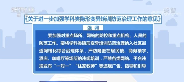 《意見(jiàn)》強(qiáng)調(diào),要加強(qiáng)對(duì)重點(diǎn)場(chǎng)所、網(wǎng)站的防控和重點(diǎn)機(jī)構(gòu)、人員的防范工作。要將學(xué)科類(lèi)隱形變異培訓(xùn)防范治理納入社區(qū)街道網(wǎng)格化綜合治理體系,嚴(yán)防隱匿在居民樓、商務(wù)樓宇、酒店、咖啡廳等場(chǎng)所的違規(guī)培訓(xùn),嚴(yán)禁各類(lèi)網(wǎng)站、平臺(tái)違規(guī)發(fā)布“一對(duì)一”“住家教師”等違規(guī)廣告。指導(dǎo)和引導(dǎo)已轉(zhuǎn)型的學(xué)科類(lèi)培訓(xùn)機(jī)構(gòu)、家政服務(wù)企業(yè)、校外培訓(xùn)機(jī)構(gòu)裁減人員和中小學(xué)在職教師等重點(diǎn)機(jī)構(gòu)和人員不參與違規(guī)培訓(xùn)。引導(dǎo)和鼓勵(lì)學(xué)生及家長(zhǎng)不參與、不組織、不支持違規(guī)培訓(xùn)。要進(jìn)一步推動(dòng)義務(wù)教育階段學(xué)校增強(qiáng)作業(yè)針對(duì)性有效性、提升課后服務(wù)質(zhì)量,更好滿足學(xué)生多樣化需求。