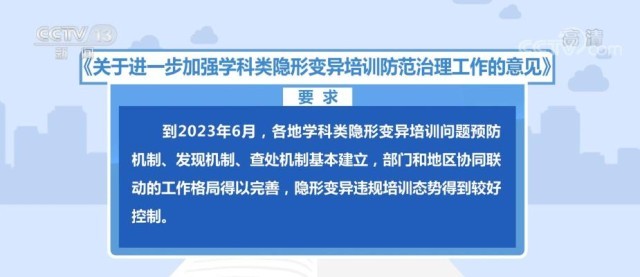 《意見(jiàn)》要求,到2023年6月,各地學(xué)科類(lèi)隱形變異培訓(xùn)問(wèn)題預(yù)防機(jī)制、發(fā)現(xiàn)機(jī)制、查處機(jī)制基本建立,部門(mén)和地區(qū)協(xié)同聯(lián)動(dòng)的工作格局得以完善,隱形變異違規(guī)培訓(xùn)態(tài)勢(shì)得到較好控制。到2024年6月,學(xué)科類(lèi)隱形變異培訓(xùn)防范治理的長(zhǎng)效機(jī)制得到健全,治理工作態(tài)勢(shì)持續(xù)向好,隱形變異培訓(xùn)得以全面清除。