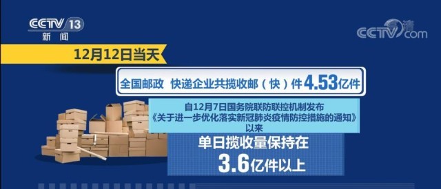國家郵政局?jǐn)?shù)據(jù)顯示,12月1日—12日,郵政快遞行業(yè)攬收量約為43.03億件,同比上升5.6%。12月12日當(dāng)天,全國郵政、快遞企業(yè)共攬收郵(快)件4.53億件。自12月7日國務(wù)院聯(lián)防聯(lián)控機制發(fā)布《關(guān)于進一步優(yōu)化落實新冠肺炎疫情防控措施的通知》以來,單日攬收量保持在3.6億件以上。
