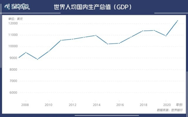 2013年,全球GDP總量為77.61萬億美元,2021年,全球GDP總量為96.1萬億美元。近10年間,全球GDP總量增長了18.49萬億美元。