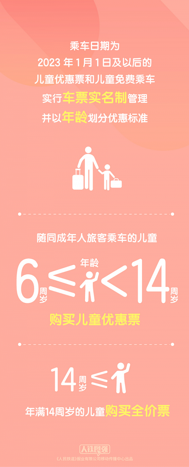 “中國(guó)鐵路”微信公眾號(hào)消息,新版《鐵路旅客運(yùn)輸規(guī)程》將于2023年1月1日起施行。購(gòu)買兒童票有哪些新變化?一起看看吧。