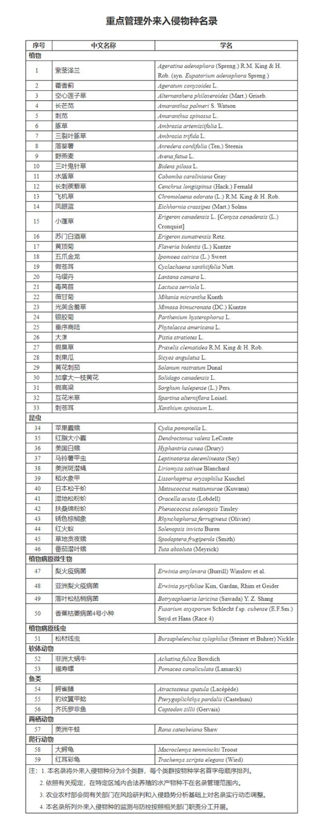 中新網(wǎng)12月20日電 據(jù)農(nóng)業(yè)農(nóng)村部網(wǎng)站20日消息,根據(jù)《中華人民共和國(guó)生物安全法》,農(nóng)業(yè)農(nóng)村部會(huì)同自然資源部、生態(tài)環(huán)境部、住房和城鄉(xiāng)建設(shè)部、海關(guān)總署和國(guó)家林草局組織制定了《重點(diǎn)管理外來(lái)入侵物種名錄》,包含鱷雀鱔、美洲牛蛙等59種外來(lái)入侵物種。《重點(diǎn)管理外來(lái)入侵物種名錄》自2023年1月1日起施行。(中新財(cái)經(jīng))