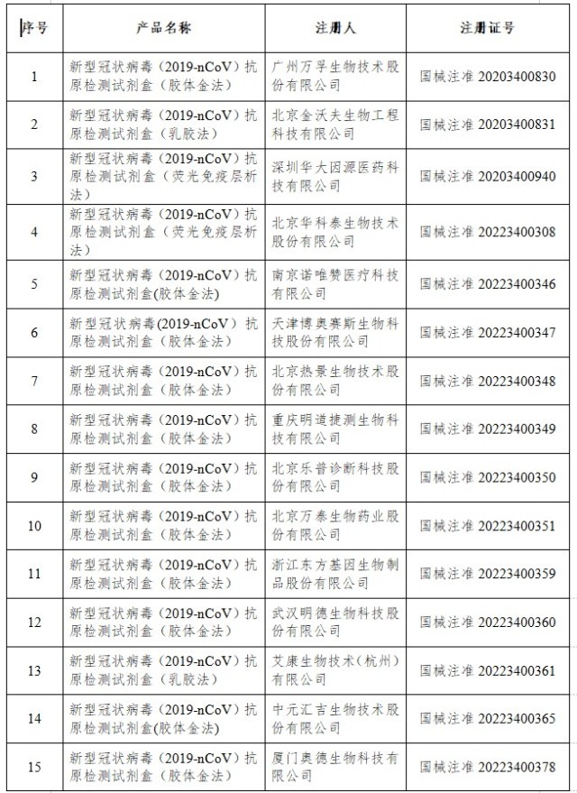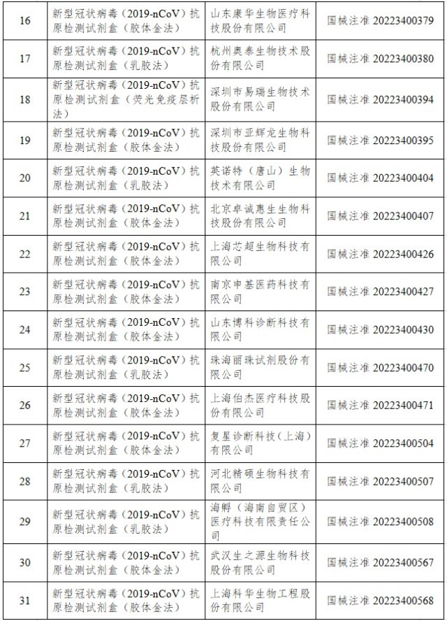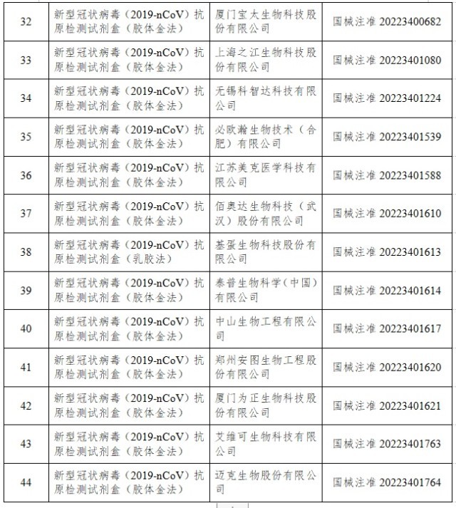 12月22日,經(jīng)國家藥監(jiān)局審查,批準(zhǔn)艾維可生物科技有限公司和邁克生物股份有限公司的2個(gè)新冠病毒抗原檢測試劑產(chǎn)品。截至目前,國家藥監(jiān)局已批準(zhǔn)44個(gè)新冠病毒抗原檢測試劑產(chǎn)品。