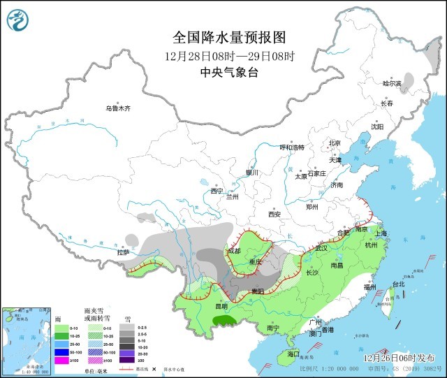 預(yù)計今天夜間至29日,南方地區(qū)將出現(xiàn)一次雨雪天氣過程,西藏東部、云南北部、川西高原、重慶東南部、貴州、湖南西部、湖北西部、安徽南部、浙江西北部等地將有小到中雪或雨夾雪,貴州中部和東部、湖南西部局地大到暴雪,貴州西部局地有凍雨;四川盆地、云南中南部、湖南南部、江西大部、浙江大部、福建北部以及廣西、廣東北部等地有小雨,局地中雨;主要降水時段為27日至28日。