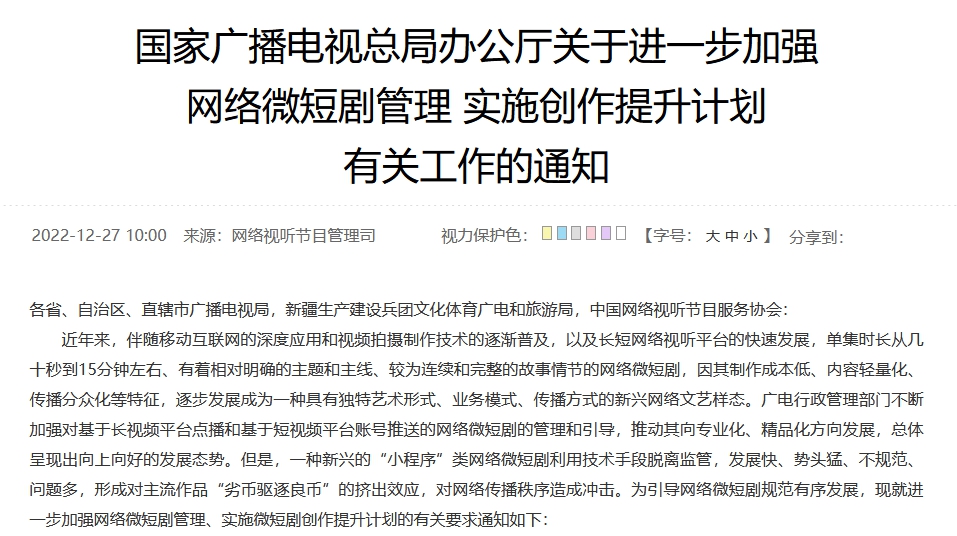 然而一種新興的“小程序”類網(wǎng)絡(luò)微短劇利用技術(shù)手段脫離監(jiān)管,發(fā)展快、勢頭猛、不規(guī)范、問題多,形成對(duì)主流作品“劣幣驅(qū)逐良幣”的擠出效應(yīng),對(duì)網(wǎng)絡(luò)傳播秩序造成沖擊。為引導(dǎo)網(wǎng)絡(luò)微短劇規(guī)范有序發(fā)展,廣電總局此次就進(jìn)一步加強(qiáng)網(wǎng)絡(luò)微短劇管理、實(shí)施微短劇創(chuàng)作提升計(jì)劃發(fā)布一系列具體措施。