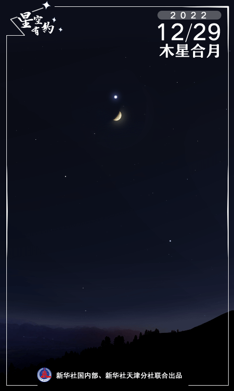 新華社天津12月27日電(記者周潤?。┨煳目破諏<医榻B,12月29日晚天宇將上演木星合月,這是2022年最后一場行星合月。屆時(shí)只要天氣晴好,我國公眾可在南方天空欣賞到明亮木星與一輪上弦月近距離競輝的唯美畫面。
