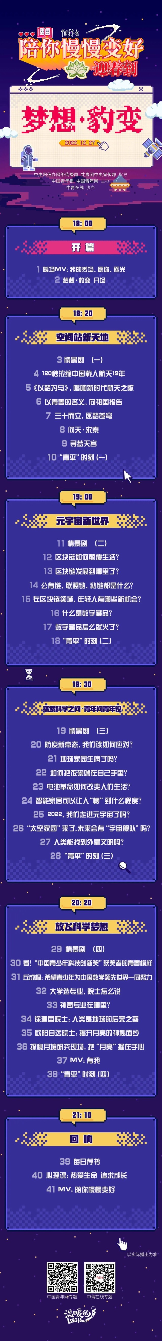 在這場聯(lián)播節(jié)目中,4位年輕記者將通過自己的經(jīng)歷和故事,和大家一起回顧2022年與科技創(chuàng)新有關(guān)的瞬間,重溫那些帶給我們“夢想”和“豹變”的激情時刻。聯(lián)播由空間站新天地、元宇宙新世界、探索科學(xué)之問、放飛科學(xué)夢想等四大篇章組成,重磅環(huán)節(jié)“探索科學(xué)之問”將聯(lián)合北京市科協(xié),共同推出聯(lián)名款“青年問青年說”,青年科學(xué)家和大學(xué)生一起盤點(diǎn)這些熱點(diǎn)科技問題:防疫新常態(tài),我們該如何應(yīng)對?極端天氣頻發(fā),地球家園生病了?2022年,我們走進(jìn)元宇宙了嗎?“太空家園”來了,未來會不會有“宇宙艦隊(duì)”…… 12月27日,我們不見不散。