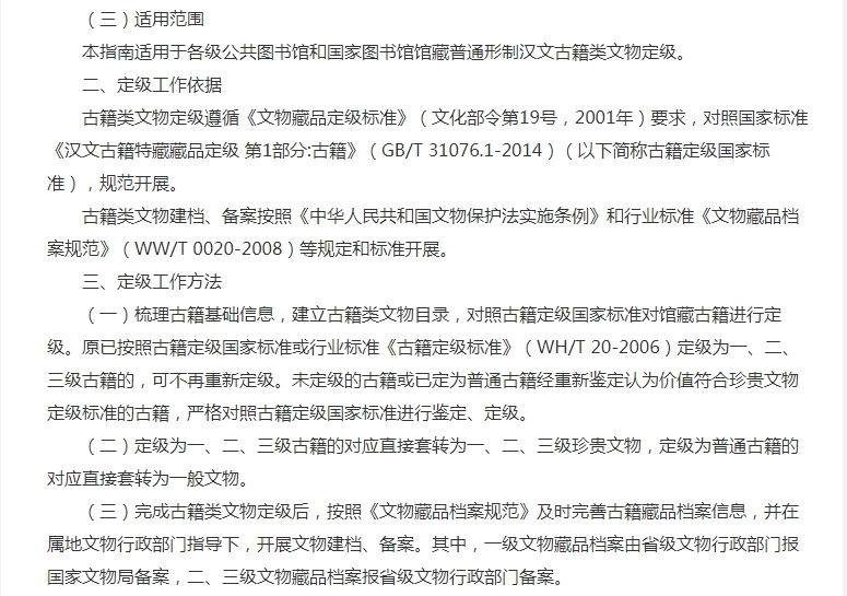 在定級工作依據(jù)中,古籍類文物定級遵循《文物藏品定級標準》(文化部令第19號,2001年)要求,對照國家標準《漢文古籍特藏藏品定級 第1部分:古籍》(GB/T 31076.1-2014)(以下簡稱古籍定級國家標準),規(guī)范開展。