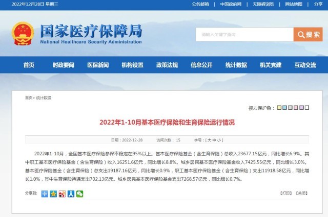 央視網(wǎng)消息:國(guó)家醫(yī)療保障局網(wǎng)站12月28日消息,2022年1-10月,全國(guó)基本醫(yī)療保險(xiǎn)參保率穩(wěn)定在95%以上?;踞t(yī)療保險(xiǎn)基金(含生育保險(xiǎn))總收入23677.15億元,同比增長(zhǎng)6.9%。其中職工基本醫(yī)療保險(xiǎn)基金(含生育保險(xiǎn))收入16251.6億元,同比增長(zhǎng)8.8%。城鄉(xiāng)居民基本醫(yī)療保險(xiǎn)基金收入7425.55億元,同比增長(zhǎng)3.0%。基本醫(yī)療保險(xiǎn)基金(含生育保險(xiǎn))總支出19187.16億元,同比增長(zhǎng)0.9%,職工基本醫(yī)療保險(xiǎn)基金(含生育保險(xiǎn))支出11918.58億元,同比增長(zhǎng)1.0%,其中生育保險(xiǎn)待遇支出702.13億元。城鄉(xiāng)居民基本醫(yī)療保險(xiǎn)基金支出7268.57億元,同比增長(zhǎng)0.7%。