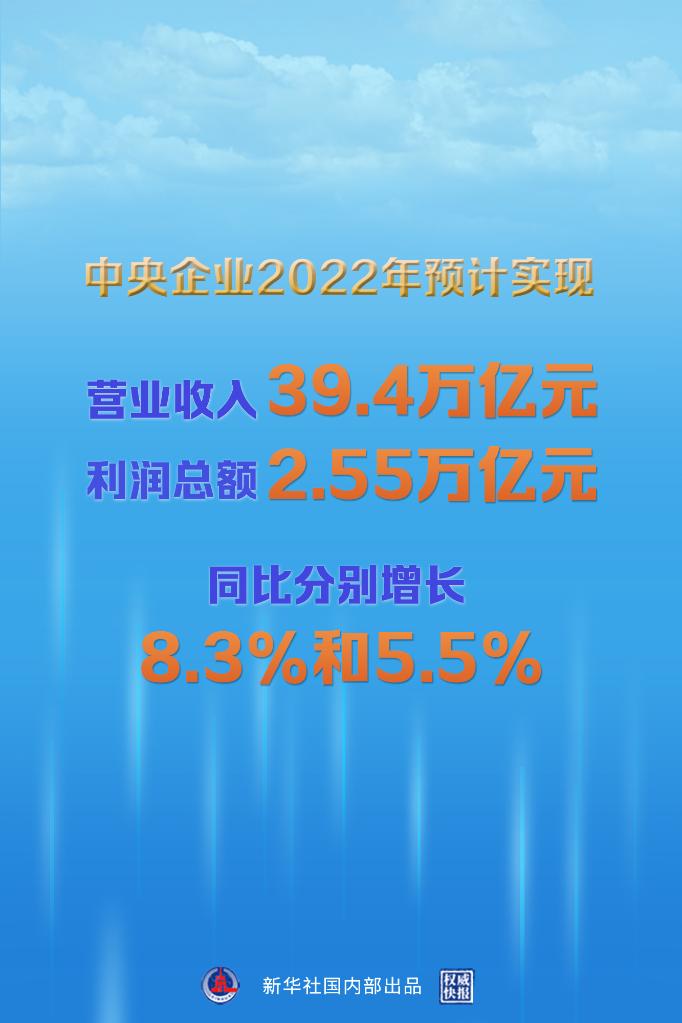 新華社北京1月5日電(記者王希)2022年,國資央企統(tǒng)籌疫情防控和企業(yè)生產(chǎn)經(jīng)營,統(tǒng)籌發(fā)展和安全,推動經(jīng)濟(jì)運(yùn)行實(shí)現(xiàn)穩(wěn)中有進(jìn),中央企業(yè)全年預(yù)計(jì)實(shí)現(xiàn)營業(yè)收入39.4萬億元、利潤總額2.55萬億元,同比分別增長8.3%和5.5%。