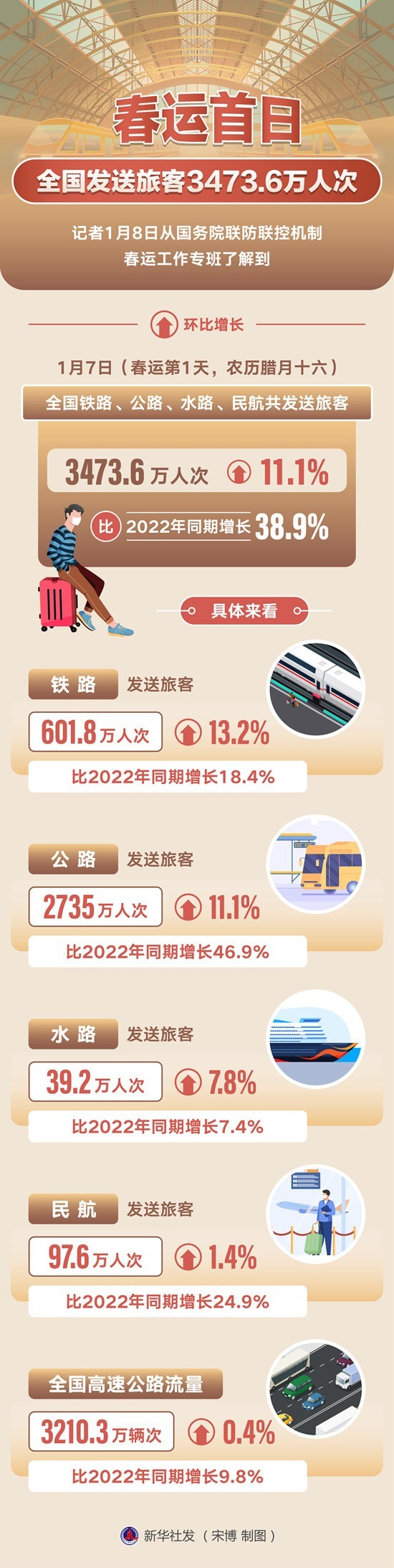 記者1月8日從國(guó)務(wù)院聯(lián)防聯(lián)控機(jī)制春運(yùn)工作專(zhuān)班了解到,1月7日(春運(yùn)第1天,農(nóng)歷臘月十六)全國(guó)鐵路、公路、水路、民航共發(fā)送旅客3473.6萬(wàn)人次,環(huán)比增長(zhǎng)11.1%,比2022年同期增長(zhǎng)38.9%。宋博/制圖(新華社發(fā))