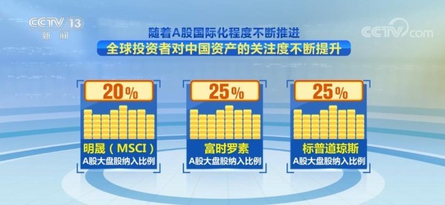 隨著A股國際化程度不斷推進,全球投資者對中國資產(chǎn)的關(guān)注度不斷提升。明晟(MSCI)、富時羅素和標(biāo)普道瓊斯的A股大盤股納入比例已分別達(dá)到20%、25%和25%。