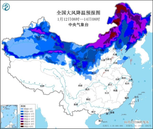 預(yù)計(jì),1月12日8時至1月14日8時,新疆沿天山以北、甘肅大部、寧夏、陜西北部、內(nèi)蒙古大部、東北地區(qū)等地部分地區(qū)將先后降溫8~12℃,其中,新疆沿天山以北、內(nèi)蒙古中東部、黑龍江中東部、吉林東部、遼寧東北部等地部分地區(qū)降溫14~16℃,局地可超過18~20℃。新疆東部、甘肅中西部、內(nèi)蒙古大部、東北地區(qū)、華北等地有6~8級大風(fēng),新疆山口風(fēng)力可達(dá)9~11級或以上。東部海區(qū)有7~9級風(fēng),陣風(fēng)可達(dá)10~11級。新疆東部和南部、青海西北部、甘肅西部和東部、內(nèi)蒙古西部、寧夏、陜西北部等地有揚(yáng)沙或浮塵,局地有沙塵暴。