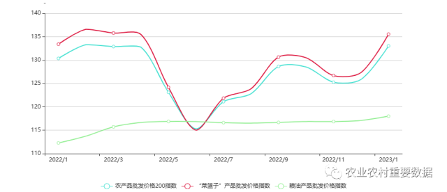 央視網(wǎng)消息:據(jù)農(nóng)業(yè)農(nóng)村重要數(shù)據(jù)公眾號消息,2023年1月,全國農(nóng)產(chǎn)品批發(fā)價(jià)格200指數(shù)為133.04,環(huán)比上漲7.16個(gè)點(diǎn), 同比上漲2.66個(gè)點(diǎn);菜籃子產(chǎn)品指數(shù)為135.57,環(huán)比上漲8.22個(gè)點(diǎn),同比上漲2.15個(gè)點(diǎn);糧油產(chǎn)品指數(shù)為118.01,環(huán)比上漲0.92個(gè)點(diǎn),同比上漲5.73個(gè)點(diǎn)。