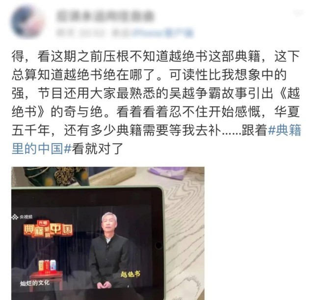 大學(xué)時讀的這部書,令總臺臺長記憶深刻。在提議策劃推出《典籍里的中國》第二季時,臺長建議關(guān)注《越絕書》這個選題。古越人絕地求生、奮斗不息的精神,值得今人傳承弘揚(yáng)!