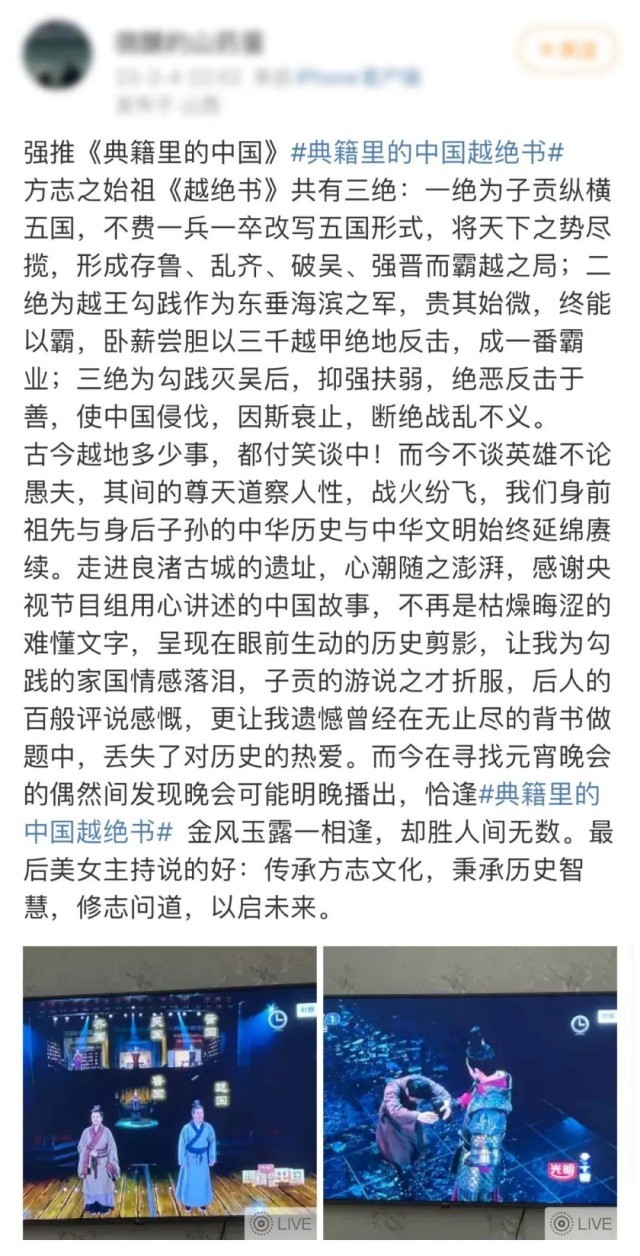 果然不負(fù)眾人所盼,第二季甫一開播,收視和好評率完美沿襲了第一季的高起點。而2月4日開播的《越絕書》,更是以史詩電影大片的精美和氣勢,將吳越爭霸驚心動魄的歷史經(jīng)典,精彩呈現(xiàn)于熒屏。第五期播出前后,9次登上熱搜熱榜,累計覆蓋微博用戶超2.6億人次;第二季豆瓣開分9.0,全平臺播放量近9億次,#典籍里的中國#主話題閱讀量累計達(dá)18.1億。