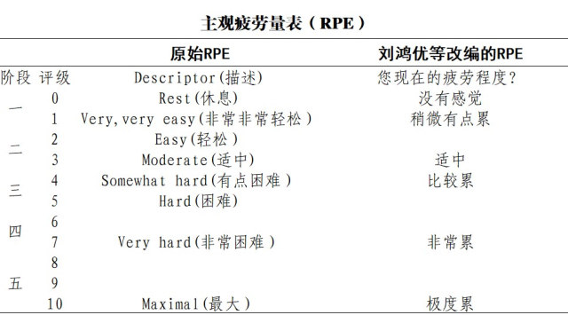 使用主觀(guān)疲勞感知評(píng)估量表,作為逐步提高活動(dòng)水平的指南。該量表是世界衛(wèi)生組織在《新冠病毒相關(guān)疾病康復(fù)指導(dǎo)手冊(cè)》對(duì)感染后患者通過(guò)記錄日常活動(dòng)以及主觀(guān)疲勞量表評(píng)分(RPE值)來(lái)監(jiān)控自身的狀況,并用于指導(dǎo)如何提高自身活動(dòng)水平的量表。該量表將運(yùn)動(dòng)中主觀(guān)感受的費(fèi)力程度劃分為0分(完全不費(fèi)力)到10分(最大程度的用力),即RPE值0~10分。