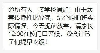 今天(2月20日)早上,一張截圖在部分金華市民朋友圈中傳播。金華一學(xué)校發(fā)布了提前放學(xué)通知:“由于病毒傳播性比較強,結(jié)合咱們班實際情況,今天提前放學(xué),請家長12:00在校門口等候?!?/p>