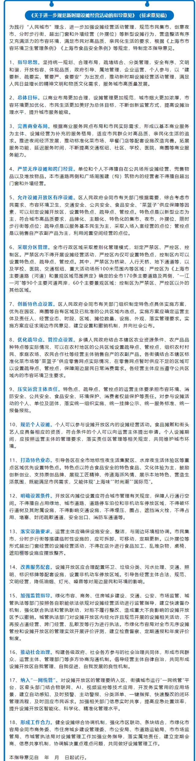 央視網(wǎng)消息:據(jù)“綠色上?!惫娞?hào)2月20日消息,根據(jù)《上海市市容環(huán)境衛(wèi)生管理?xiàng)l例》,為進(jìn)一步加強(qiáng)設(shè)攤經(jīng)營(yíng)活動(dòng)管理,規(guī)范市民集市、創(chuàng)意夜市、分時(shí)步行街、超出門窗和外墻經(jīng)營(yíng)(簡(jiǎn)稱外擺位)等新型設(shè)攤行為,結(jié)合上海市實(shí)際,上海市綠化和市容管理局經(jīng)會(huì)同市相關(guān)部門研究,擬定了《關(guān)于進(jìn)一步規(guī)范新時(shí)期設(shè)攤經(jīng)營(yíng)活動(dòng)的指導(dǎo)意見》(征求意見稿),現(xiàn)面向社會(huì)公開征求意見。市民和各單位可以將書面意見直接寄送至上海市膠州路768號(hào)308室,郵編:200040;也可以發(fā)送電子郵件至shsrglc@126.com。征求意見截止日期:2023年3月22日。