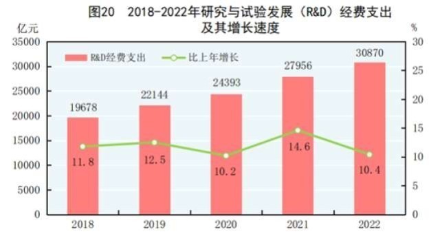 中國網(wǎng)財經(jīng)2月28日訊 國家統(tǒng)計局28日發(fā)布的2022年國民經(jīng)濟(jì)和社會發(fā)展統(tǒng)計公報顯示,2022年,全年研究與試驗(yàn)發(fā)展(R&D)經(jīng)費(fèi)支出30870億元,比上年增長10.4%,與國內(nèi)生產(chǎn)總值之比為2.55%,其中基礎(chǔ)研究經(jīng)費(fèi)1951億元。國家自然科學(xué)基金共資助5.19萬個項(xiàng)目。截至年末,正在運(yùn)行的國家重點(diǎn)實(shí)驗(yàn)室533個,納入新序列管理的國家工程研究中心191個,國家企業(yè)技術(shù)中心1601家,大眾創(chuàng)業(yè)萬眾創(chuàng)新示范基地212家。國家科技成果轉(zhuǎn)化引導(dǎo)基金累計設(shè)立36支子基金,資金總規(guī)模624億元。國家級科技企業(yè)孵化器1425家,國家備案眾創(chuàng)空間2441家。