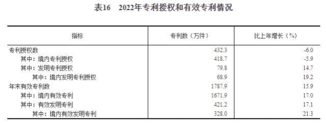 全年授予專利權(quán)432.3萬件,比上年下降6.0%;PCT專利申請受理量7.4萬件。截至年末,有效專利1787.9萬件,其中境內(nèi)有效發(fā)明專利328.0萬件。每萬人口高價值發(fā)明專利擁有量9.4件。全年商標(biāo)注冊617.7萬件,比上年下降20.2%。全年共簽訂技術(shù)合同77萬項(xiàng),技術(shù)合同成交金額47791億元,比上年增長28.2%。我國公民具備科學(xué)素質(zhì)的比例達(dá)到12.93%。