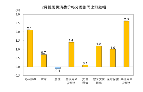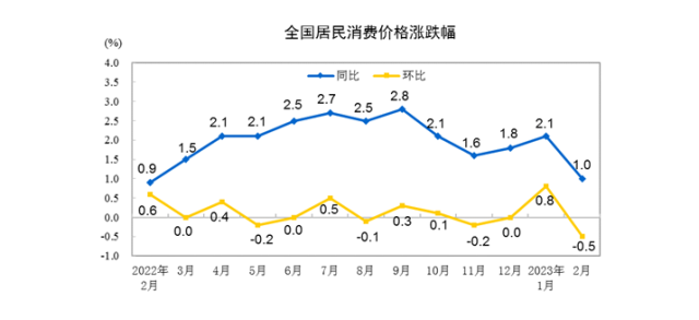 2月份居民消費(fèi)價(jià)格同比上漲1.0% 環(huán)比下降0.5%