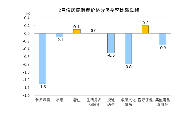 2月份,全國居民消費(fèi)價(jià)格環(huán)比下降0.5%。其中,城市下降0.5%,農(nóng)村下降0.5%;食品價(jià)格下降2.0%,非食品價(jià)格下降0.2%;消費(fèi)品價(jià)格下降0.6%,服務(wù)價(jià)格下降0.4%。