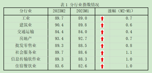 2月份,隨著經濟逐步恢復,8個行業(yè)指數(shù)均連續(xù)兩個月上升。服務業(yè)指數(shù)恢復速度領先,其中,社會服務業(yè)、信息傳輸計算機服務軟件業(yè)、住宿餐飲業(yè)和批發(fā)零售業(yè)指數(shù)分別上升1.1、1.0、1.0和0.8點。