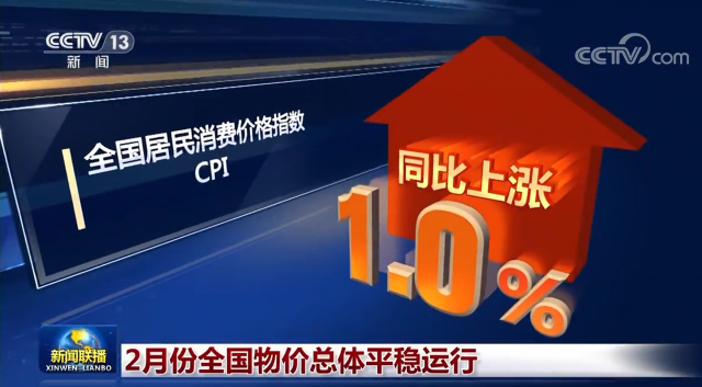 央視網消息(新聞聯(lián)播):國家統(tǒng)計局今天(3月9日)發(fā)布數(shù)據顯示,2月份,受市場供應充足等因素影響,全國居民消費價格指數(shù)(CPI)同比上漲1.0%,漲幅比上月回落1.1個百分點,物價總體平穩(wěn)運行。