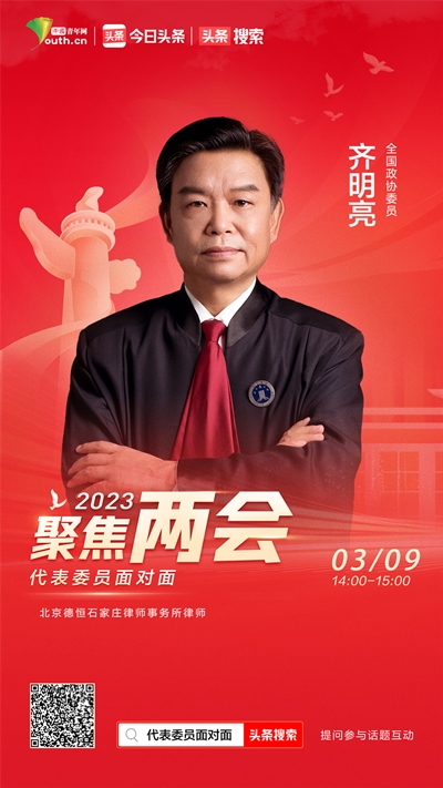 中國青年網(wǎng)北京3月9日電(記者 薛艷麗)3月9日,全國政協(xié)委員,河北省律師協(xié)會副會長,北京德恒(石家莊)律師事務所律師齊明亮做客中國青年網(wǎng)聯(lián)合今日頭條舉辦的線上“2023代表委員面對面”微訪談活動,和大家分享今年全國兩會期間自己帶來的提案。
